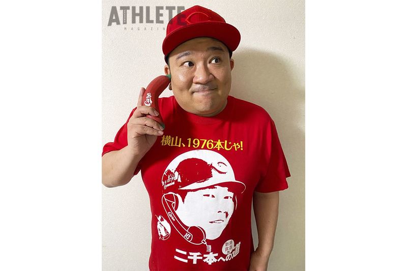 そしてこのTシャツには『横山、1976本じゃ!』と文字が入っていて、その下に電話をしている新井さん。そして左下にはその電話を受けている、当時の背番号24・横山弘樹投手がデザインされています。