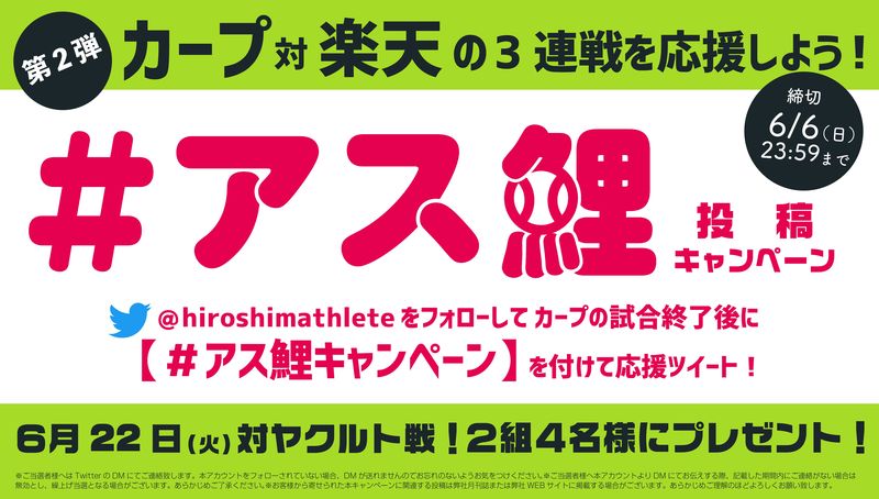 本日6月4日〜6日に開催される、楽天戦を戦うカープ選手に向けて、通常の【#アス鯉】投稿を行っていただき、本キャンペーンに参加をご希望の方は【#アス鯉キャンペーン】も付けてご参加ください!