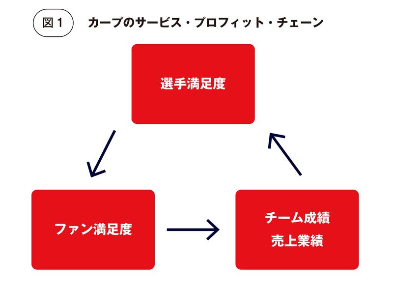 2019年時点で、マツダスタジアムの年間観客動員数は220万人、売上高は前年から約20億の減少となったものの、約169億円。そして45年連続の黒字を達成した。これは、カープの『サービス・プロフィット・チェーン」(図1)が上手く回っていることを意味している。