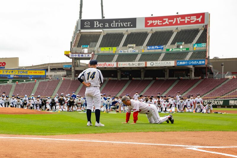 達川氏は祝辞もそこそこに、「打たれたり、抑えたり色々ありますが、練習をしっかりしていなければ良いプレーはできないよ。おじさんたちは、君たちの歳から1日も欠かさずにやっていたことが1つあります。それは、腕立て20回! 朝昼晩と同じように欠かしたことはない。やり方を教えます!」と、即興の“腕立て伏せ指導”がいきなりスタート。