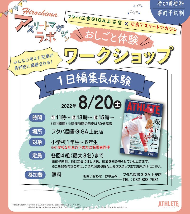 「広島アスリートマガジンラボ」とは、20年以上の歴史を持つ広島アスリートマガジンを教科書に、広島のスポーツの魅力を研究していく、子ども向けの体験型ワークショップ。雑誌が完成するまでの仕組み、編集・執筆、イラスト作成など、普段は聞くことのできない広島アスリートマガジン制作の裏側を知ることができます。