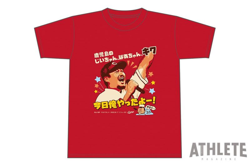 Tシャツにはヒーローインタビューで松山が語った「鹿児島のじいちゃん、ばあちゃん、キク 今日俺やったよー!」の決め台詞がデザインされている。