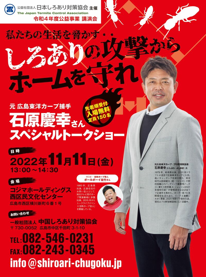 2022年11月11日(金)に「公益社団法人日本しろあり対策協会」が、元広島東洋カープ捕手・石原慶幸さん(プロ野球解説者)を招いたスペシャルトークショーを開催することが決定した。