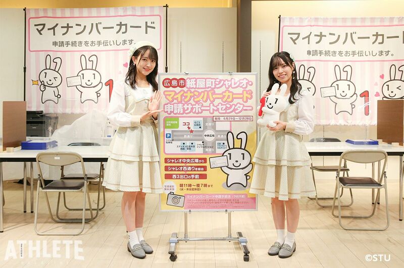 アイドルグループSTU48の石田千穂(いしだ ちほ)さん・岩田陽菜(いわた ひな)さんがマイナンバーカードの申請体験を行うため「紙屋町シャレオ・マイナンバーカード申請サポートセンター」(広島市中区)でのプレス発表会に登場した。