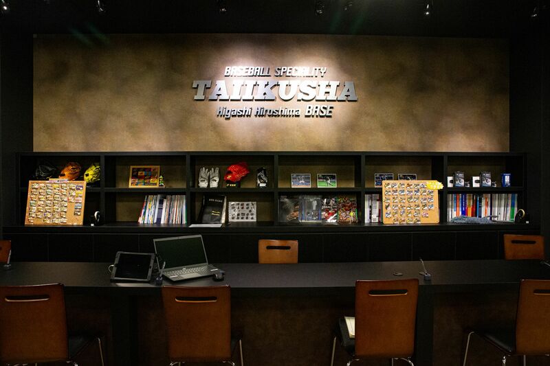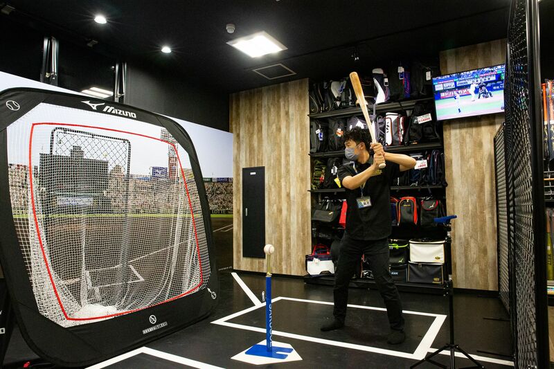 写真は店内に設置されている試打や測定も楽しめるスイングスペース。バットを思いっきり振れる広大な敷地がある東広島店ならではの場所だ。数々の選手サポートをしてきたスタッフがデータとともに丁寧に教えてくれるので、商品をより正確にチョイスできる。他チーム選手との情報交換などもできるような、集いの場になる未来が訪れるかもしれない。