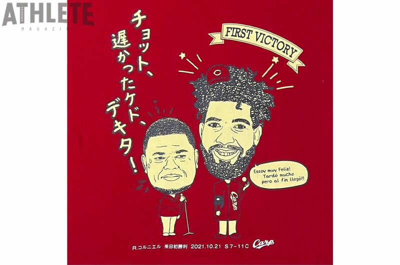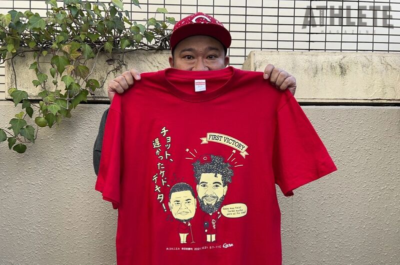ヒーローインタビューでのフェリシアーノ通訳とのやり取りも微笑ましいものがありましたよね。そんな様子も来日初勝利記念Tシャツには描かれています。