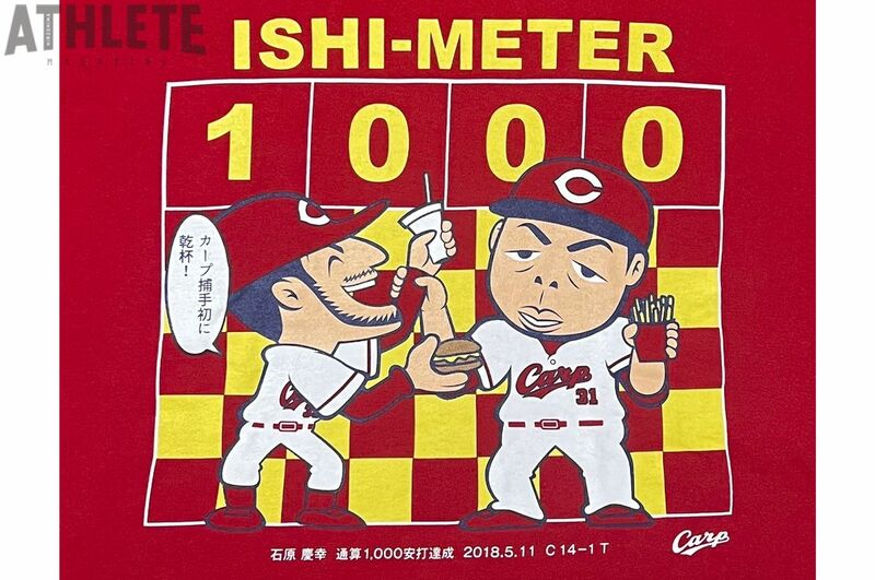 この試合まで1,000安打へ残り2本に迫っていた石原選手。第1打席でこのシーズン第1号の2ランホームランを打ち、大記録まであと1本に。そして迎えた3回の第2打席、阪神の能見投手(当時)からレフト前ヒットを打ち1,000安打を達成しました。