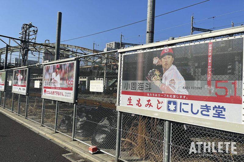マツダスタジアムへ向かう線路沿い、カープファンにはお馴染みのスポットである『カープロード』には、チームの主力選手から期待の若手選手まで、前年の活躍シーンの写真を大きく配した選手紹介パネルがずらりと並ぶ。