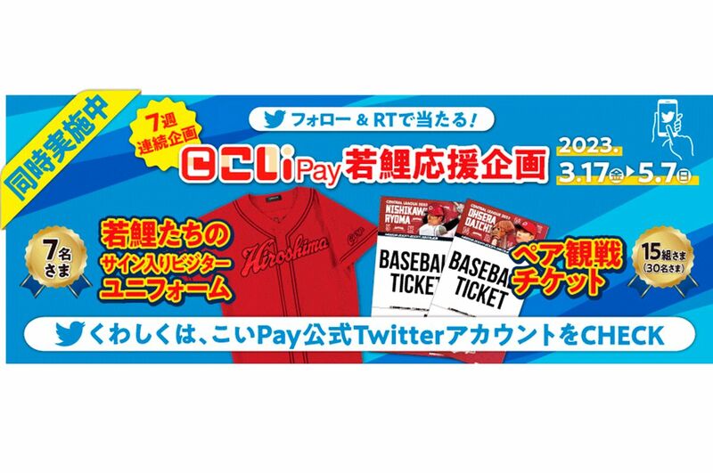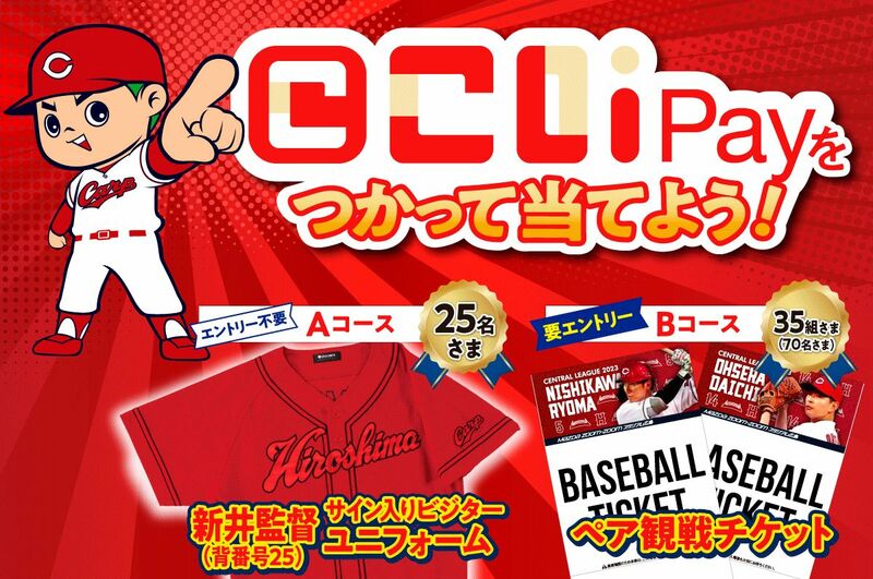 新井貴浩新監督のサイン入りユニフォームや、ペア観戦チケットが当たるキャンペーンに、"こいPay"で簡単にご参加いただけます。
