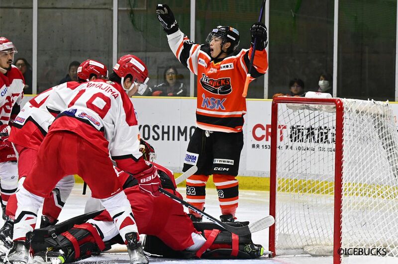 試合は1点ビハインドで最終第3ピリオドへ。まずは同点に追いつきたいアイスバックスは猛攻を仕掛ける。果敢に攻めると、磯谷奏汰と相馬秀斗がつなぎ大椋舞人が最後に押し込む形で同点ゴールを決めた。アイスバックスは34本のシュートを放ち、終始試合を支配するも、一瞬の隙をつかれレッドイーグルス小林斗威に2点目を奪われた。連敗脱出かと思われた瞬間のゴールが決勝点となり1対2で敗れた。