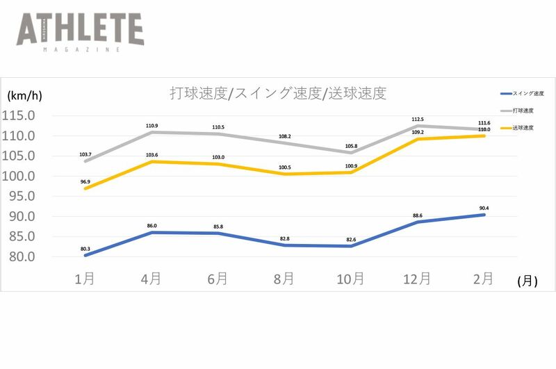 「昨年の1月から約1年を比較したのがこちらのグラフ(図1参照)です。灰色の線が打球速度、青色の線がスイングスピードです。夏場の疲労などで身体のキレが変わるので綺麗な右肩上がりとはなりませんが、1年での比較で2つの数値は両方とも10キロほど向上しました。相関性のある数値が上がっているという点では、選手の取り組み方が可視化されている良い例だと思います」