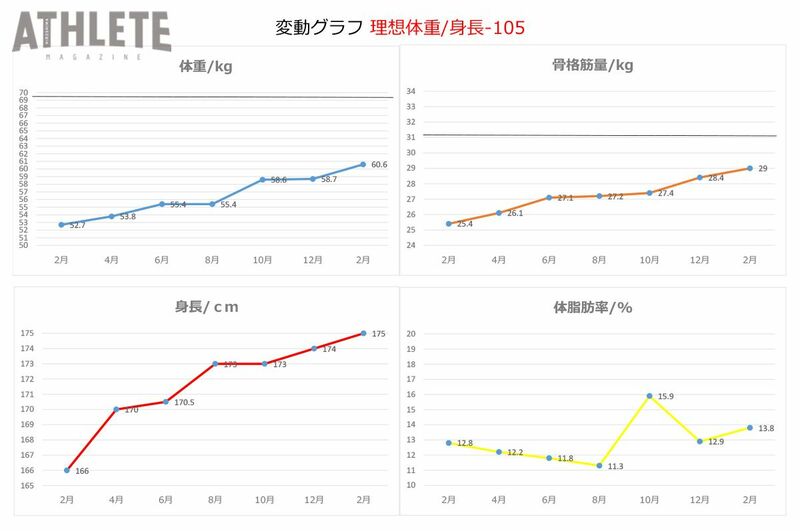 「こちらも身長、体重、骨格筋量の3つの数値が比例しているのがわかります。この数字なくして、前述のスイングスピードなどの数値は上がってこないのです。また、成長期の選手たちなので正しく身体を大きくして、正しい強度の練習をしないと選手生命に関わるケガにもつながりかねないので、これらの数値を確認する際にはより注意をしています」