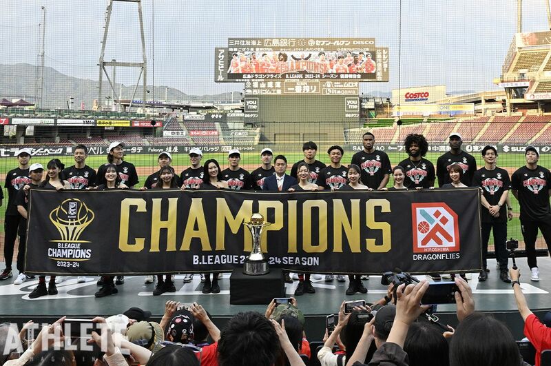 『日本生命 B.LEAGUE FINALS 2023-24』年間チャンピオンに輝いた広島ドラゴンフライズは、1日、マツダスタジアムで優勝報告会を開催した。