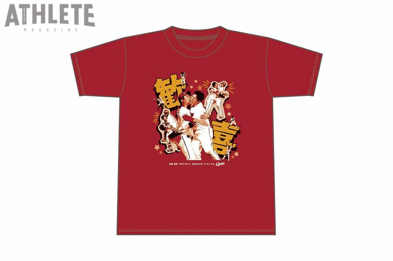 Tシャツには、チーム一丸となり勝ち取った逆転サヨナラ勝利を、勝利の立役者である坂倉を中心に喜び合うシーンがデザインされている。カープは27日のヤクルト戦で、1点を追う9回、2死二塁から石原貴規が13球粘り四球で出塁すると、続く坂倉が2点タイムリーを放ち、劇的な逆転勝利を収めていた。