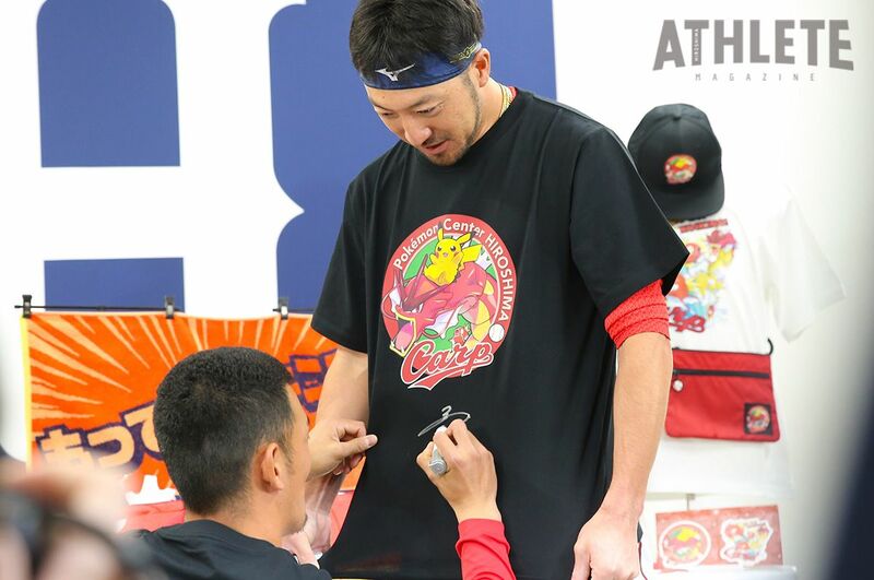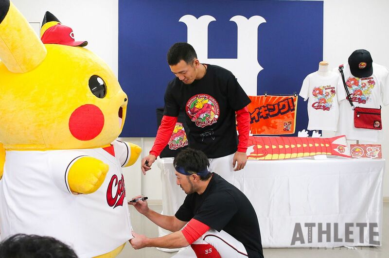 会見には、菊池涼介選手、矢野雅哉選手と、ピカチュウが参加し、コラボグッズが初お披露目された。