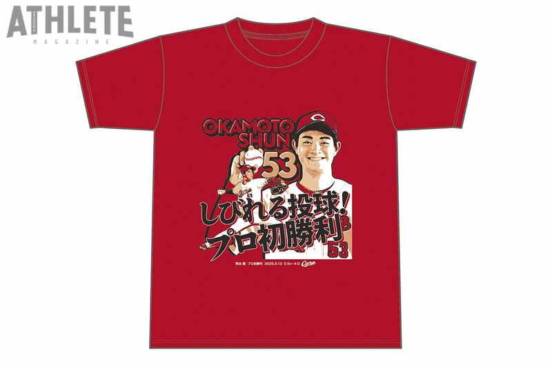 Tシャツには、ウイニングボールを手に笑顔を見せる岡本の写真と、「『しびれる』場面でルーキーらしからぬ『投球』をしている姿」をデザイン。『【記念】岡本駿プロ初勝利Tシャツ』は5月15日(木)16:00までの時間限定で、通信販売(カープ公式ホームページ・FAX)で購入を受け付ける。また、マツダ スタジアム正面グッズショップでは15日の閉店まで販売される。