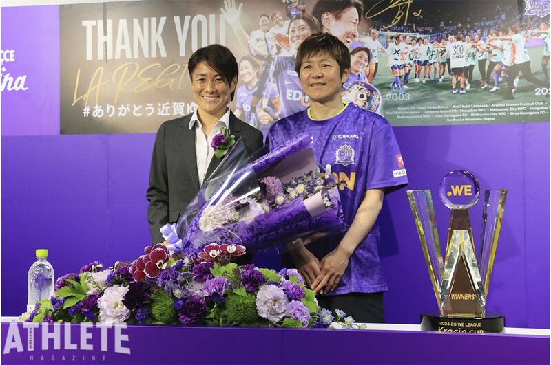 5月17日のアルビレックス新潟レディース戦(▲2-2)で今シーズンの全日程を終えたレジーナ。20日、今シーズン限りで現役引退する近賀ゆかりの引退記者会見を行われた。会見では同じく今シーズン限りでチームを離れる福元美穂もサプライズ登場。抽選で選ばれたサンフレッチェクラブ・プレミアム会員も見守るなか、笑顔あふれる会見となった。