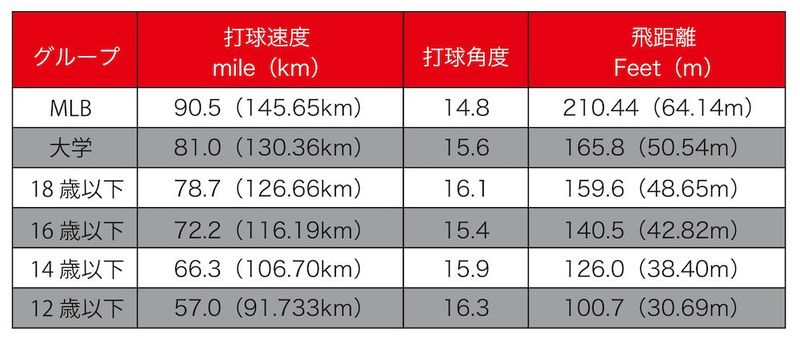 参考までに、ラプソードが出している打球速度・打球角度・飛距離のデータを紹介します。いずれもアメリカの選手を対象としたものです(ラピソードについては、このコラムで何度も紹介していますので、過去の記事をご覧ください)。
