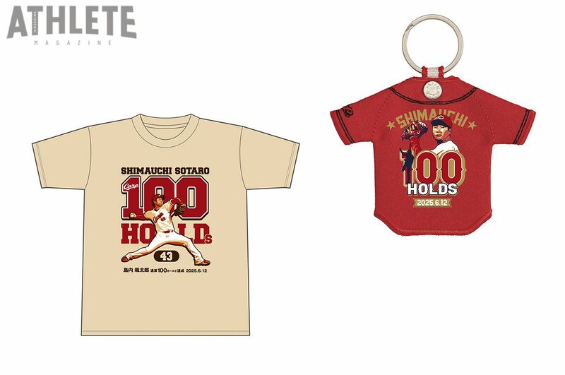 島内は6月12日のロッテ戦で同点の6回に登板。見事にピンチを切り抜け、プロ7年目で100ホールドの記録を達成した。記念グッズはTシャツとユニフォームキーホルダーの2種類で、球団は「Tシャツは、島内投手が積み重ねた 100 ホールドの記録をヴィンテージ感のあるデザインで表現しました。ユニフォームキーホルダーは、島内投手のマウンドでの姿をデザインし、『100』ホールドの『1』の部分に島内投手のシルエットを合わせました」と紹介。