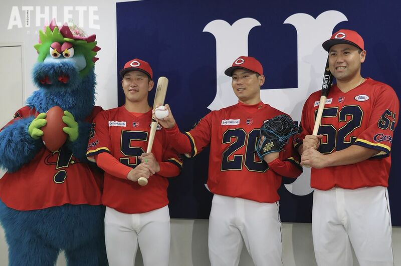 お披露目会見には末包昇大、小園海斗、栗林良吏とスラィリーが登場。自身もアメフトが好きだという末包は、「前面に背番号が出ているのも一つのポイントかなと思います。デザインもすごく良い」と笑顔で話し、栗林は「4年ぶりにこうした限定ユニホームが出て、ファンのみなさんと一緒に盛り上がる機会をつくってもらえた。あとは自分たちがしっかり、力強いパフォーマンスをするだけ」とコメントした。