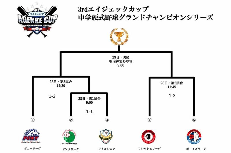 8月28日、29日に、中学硬式野球の頂点を決める『3rdエイジェックカップ 中学硬式野球グランドチャンピオンシリーズ』が開幕する。この大会は中学硬式野球5団体(ポニーリーグ、ヤングリーグ、リトルシニア、ボーイズリーグ、フレッシュリーグ)の各団体の選手権を制したチームが一同に集い、統一ルールの下で、リーグの垣根を超えた中学硬式野球日本一を目指す大会だ。11日に組み合わせ抽選会の結果が発表され、対戦カードが決定した。