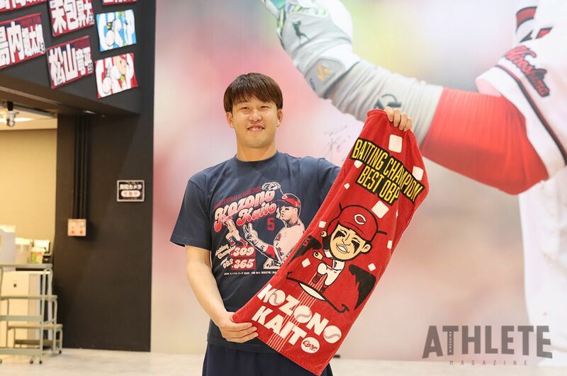今季チームは5位と不本意な結果に終わったが、個人としては首位打者、最高出塁率の2冠を獲得し、記録に残るシーズンを送った。この会見で小園は、自身の2冠を記録した記念グッズのTシャツを着用し、似顔絵が書かれたタオルなどの現物を披露した。