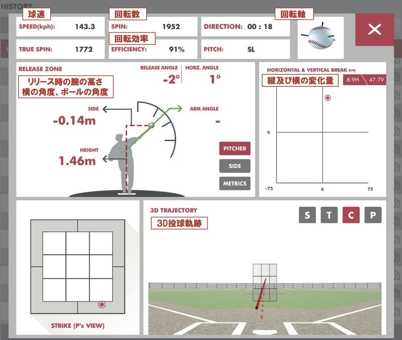 まず、投手がラプソードを使った際に出てくる『投球データ』のサンプルをご覧ください。
