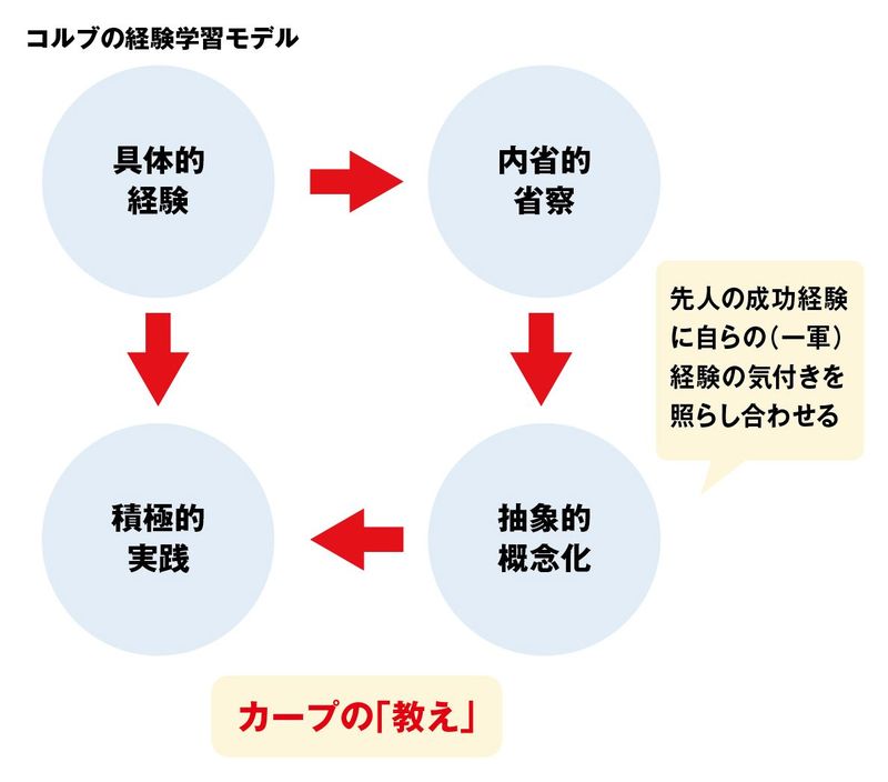 組織行動学者のデービット·コルブの経験学習モデルで考えるならばその術は、経験と省察を繰り返し、身体知を獲得する「教え」ということができるだろう。