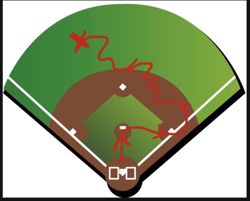 1990年6月24日の横浜スタジアムで、大門投手から背中を通るボールを投げられたアレン。球が自分に向かってきたその瞬間、大門投手へ向けて走り出していたと言っても過言ではありません。それほどのスピードでスタートを切ったアレン。逃げる大門選手を追って横浜スタジアムを駆け回りました。アレンと大門が走った動きが以下の図になります。