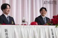 <div class="caption">入団会見で佐藤柳之介(左)とともに笑顔を見せる渡邉(右)</div>